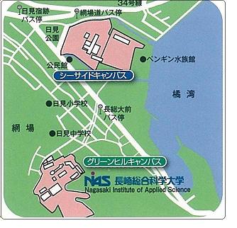 次の交差点を左折、進行、日見公園先のガソリンスタンドがある交差点を左折すると右側がシーサイドキャンパス。